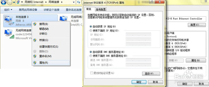 2.选择本地连接---右键---属性。在属性中选择“Internet协议版本 4(TCP/Ipv4)”双击打开。